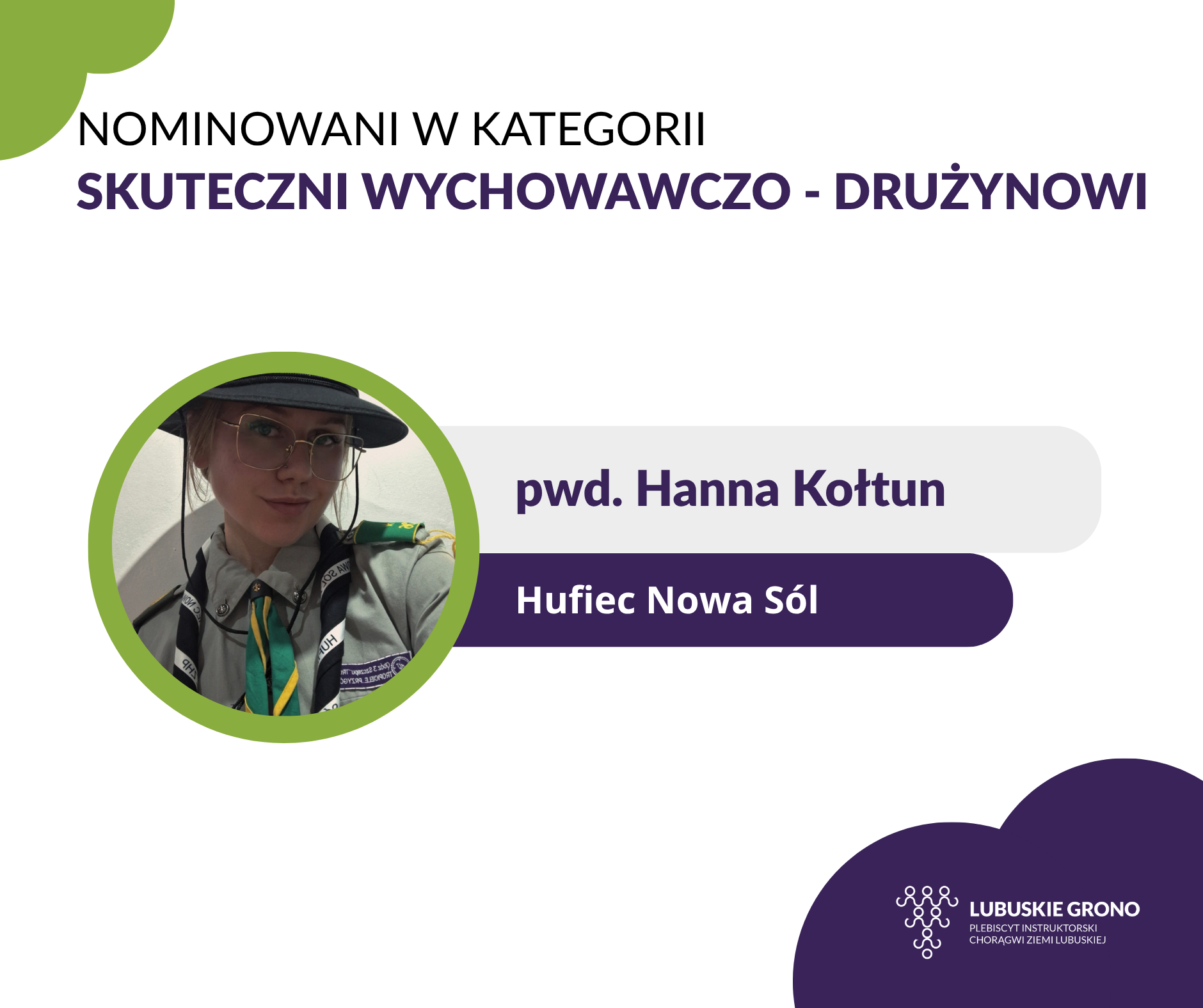 Druhna Hanna Kołtun od października 2023 roku pełni funkcję drużynowej 26 Drużyny Harcerskiej „Poszukiwacze Zieleni” im. Św. Jerzego w Hufcu Nowa Sól. Z harcerstwem związana jest od najmłodszych lat, a dziś z pasją prowadzi drużynę, która dynamicznie się rozwija. Dzięki jej zaangażowaniu i trosce o potrzeby wychowanków zbiórki są ciekawe, różnorodne i sprzyjają zdobywaniu nowych doświadczeń. Druhna Hania dba o realizację prób na stopnie, sprawności, tropy i wyzwania, wspiera zastępowych w ich pracy oraz współpracuje z kadrą i rodzicami harcerzy. 26 DH „Poszukiwacze Zieleni” posiada bogatą obrzędowość – bohatera, proporce, piosenki oraz własny Turniej Świętego Jerzego, który stał się tradycją hufca. Druhna Hania jest przykładem instruktorki, która łączy harcerską pasję z odpowiedzialnym wychowaniem młodych ludzi.