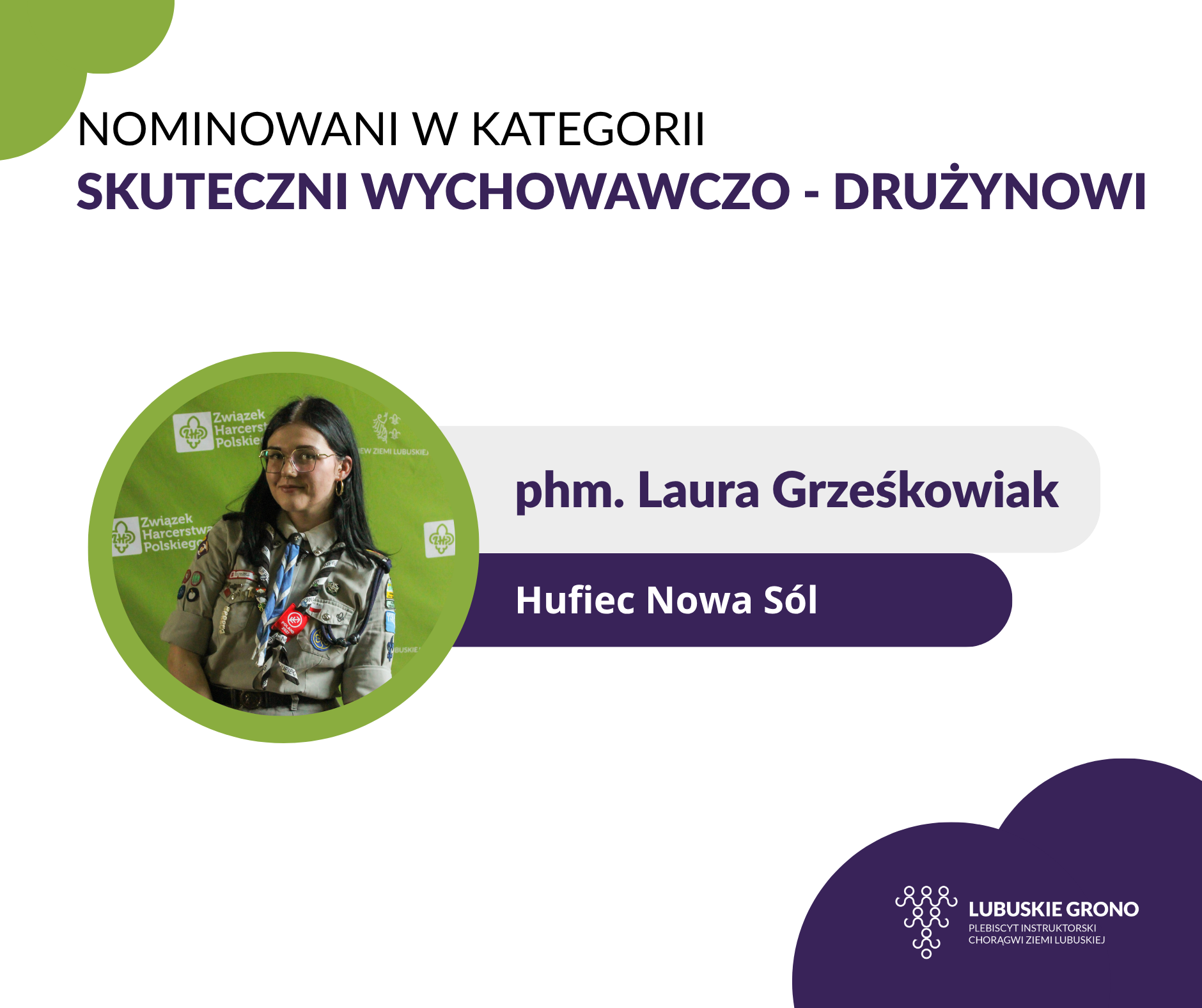 Druhna Laura Grześkowiak pełni funkcję drużynowej 7 Drużyny Wędrowniczej „Vesper” oraz komendantki 3 Szczepu „Trop” w Hufcu Nowa Sól. Jest instruktorką zaangażowaną w działania kształceniowe zarówno w hufcu, jak i chorągwi, a także w pracę zespołu promocji. Utworzyła środowisko wędrownicze, odpowiadając na potrzebę stworzenia przestrzeni dla starszych harcerzy i kadry, którzy chcieli rozwijać się i działać w duchu wędrowniczym. W drużynie funkcjonuje konstytucja, odbywają się wybory drużynowego, a wędrownicy realizują próby na stopnie HO i HR, tropy oraz podejmują różnorodne wyzwania. Drużyna angażuje się w służbę i inicjatywy społeczne, m.in. poprzez cykl „Prasówki Vesper” czy działania podczas Integracyjnych Turniejów Bocci. Druhna Laura inspiruje swoich wędrowników przykładem, łącząc rozwój osobisty z prawdziwą radością harcowania.