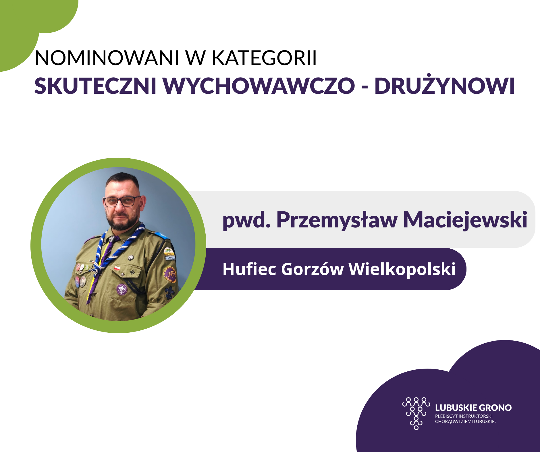 Drużynowy Przemysław Maciejewski prowadzi 48 Drużynę Harcerską „Wilcza Zamieć” w Hufcu Gorzów Wielkopolski ZHP. Dzięki jego zaangażowaniu i konsekwentnej pracy drużyna dynamicznie się rozwija, a jej liczebność w ostatnich latach wzrosła do ponad 40 osób. Druh Przemysław stawia na jakość działań i wychowanie poprzez działanie – harcerze zdobywają sprawności, podejmują wyzwania i aktywnie uczestniczą w życiu lokalnej społeczności. Wspólnie z rodzicami i kadrą włącza się w organizację wydarzeń miejskich, takich jak Kostrzyn na Fali czy Jarmark Bożonarodzeniowy, pokazując harcerstwo otwarte i zaangażowane. W drużynie funkcjonuje system małych grup, a kadra z przybocznymi wspiera piony harcerski i starszoharcerski. Druh Przemysław motywuje młodą kadrę do rozwoju, przygotowując swoich następców do pełnienia funkcji instruktorskich. Jego praca to przykład nowoczesnego i skutecznego przywództwa opartego na harcerskich wartościach i osobistym zaangażowaniu.